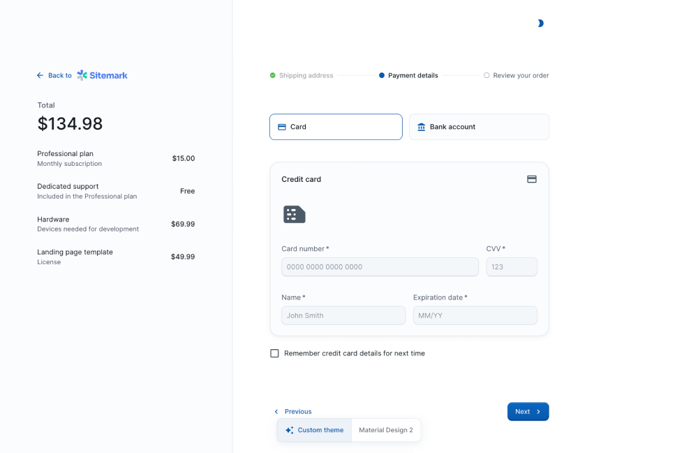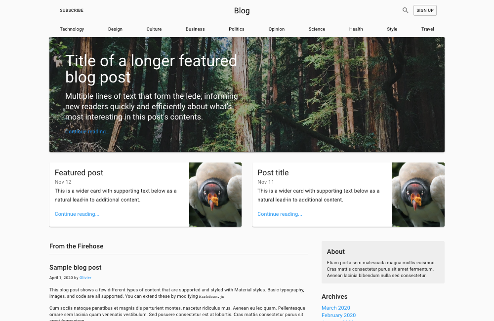 Our curated collection of free Material UI templates includes dashboards, landing pages, sign-in and sign-up pages, a blog, a checkout flow, and more. They can be combined with one of the example projects to form a complete starter.